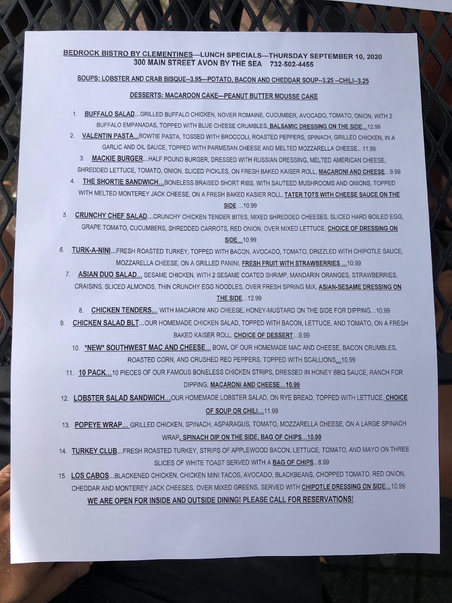 Bistro Avon Inc. Menu